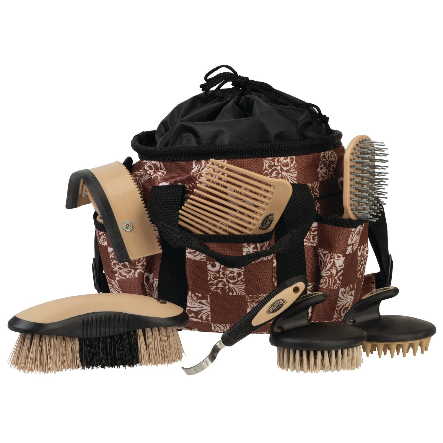 - Includes a comb, hoof pick, palm held curry comb, palm held face brush, mane and tail brush, dandy brush and sweat scraper/coarse curry combo